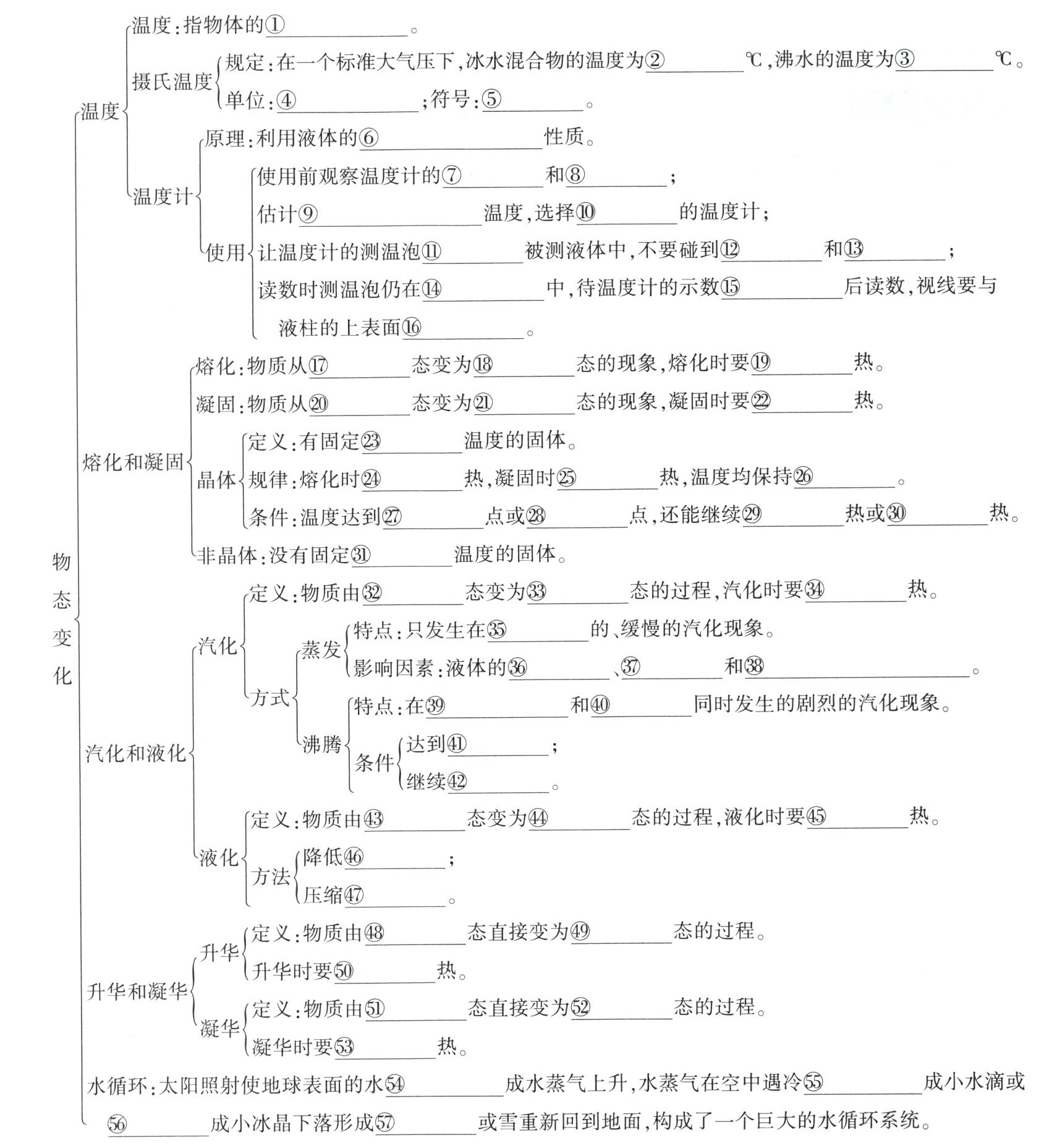 ①冷热程度;②0;③100;④摄氏度;⑤℃;⑥热胀冷缩;⑦量程;⑧分度值;⑨被测物体;⑩合适量程;⑪全部浸入;⑫容器底;⑬容器壁;⑭被测液体;⑮稳定;⑯相平;⑰固;⑱液;⑲吸;⑳液;㉑固;㉒放;㉓熔化(或凝固);㉔吸;㉕放;㉖不变;㉗熔;㉘凝固;㉙吸;㉚放;㉛熔化(或凝固);㉜液;㉝气;㉞吸;㉟液体表面;㊱温度;㊲表面积;㊳液体表面上方空气流动速度;㊴液体表面;㊵内部;㊶沸点;㊷吸热;㊸气;㊹液;㊺放;㊻温度;㊼体积;㊽固;㊾气;㊿吸;㉑气;㉒固;㉓放;㉔蒸发;㉕液化;㉖凝华;㉗雨