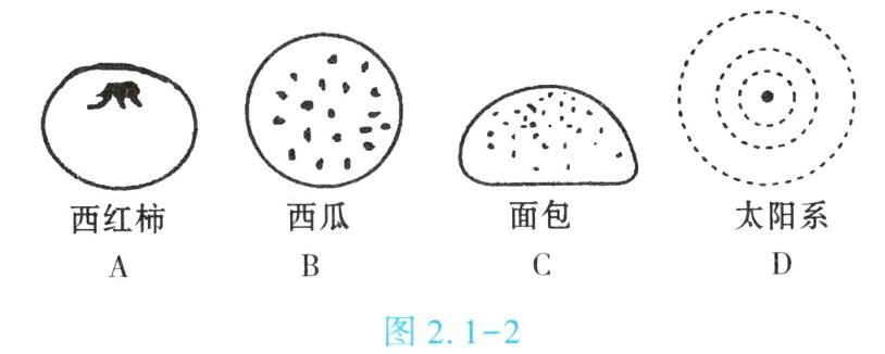 2. (★★)自从汤姆孙发现了电子,科学家们便开始研究原子的内部结构,提出了许多原子结构的模型。1911 年,卢瑟福提出了最为大家所接受的原子“核式结构模型”,图 2.1 - 2 中与其最相似的是【