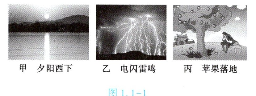 2. (★★)在生活中,我们每天都要面对许多与力、声、热、光、电等有关的现象,在自然科学中诞生的物理学就是为了研究这些现象,找出它们发生的原因,研究怎样利用它们为人类服务。观察图1.1 - 1,按要求将它们分类。(填“甲”“乙”或“丙”)