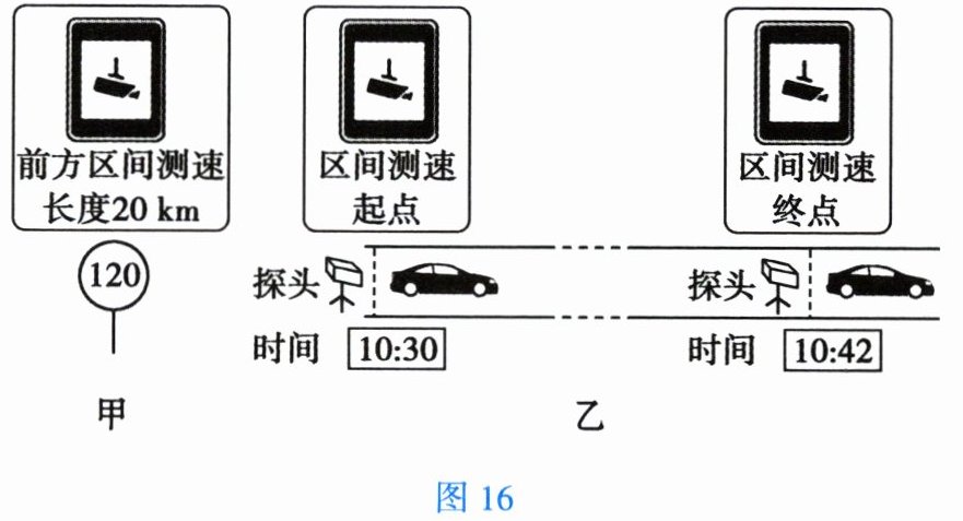 20. “区间测速”可以有效监管汽车超速。在一段道路上布设两个监控点,分别记录车辆到达“测速起点”和“测速终点”的时间,通过计算车辆在此区间行驶的平均速度来判断汽车是否超速。如图16甲为暑假小明和爸爸自驾去兰州旅游时经过某一区间测速的提示牌,通过该测速路段的时间如图16乙所示。