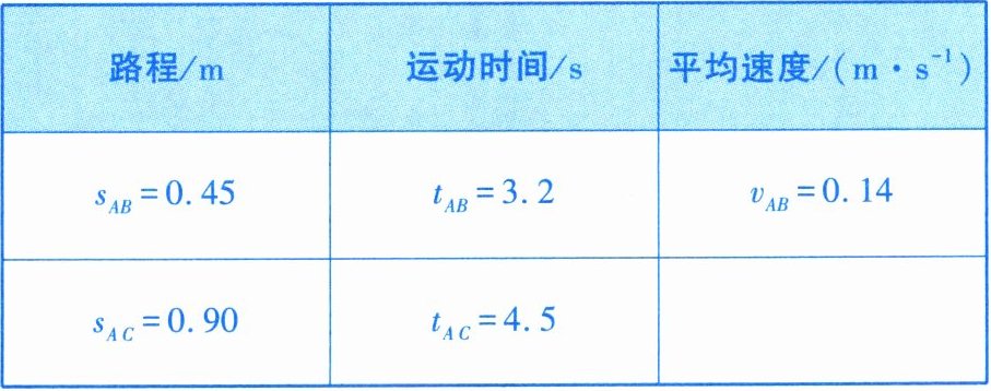 BC段路程$s_{BC}=s_{AC}-s_{AB}=0.90\,m-0.45\,m=0.45\,m$,时间$t_{BC}=t_{AC}-t_{AB}=4.5\,s-3.2\,s=1.3\,s$,速度$v_{BC}=\frac{0.45\,m}{1.3\,s}\approx0.35\,m/s$。