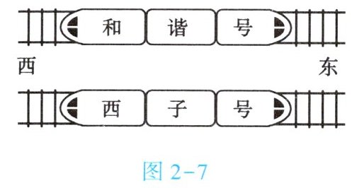 6. ($★★★$)(双选)两列火车如图 2 - 7 所示,“西子号”列车上的乘客看到“和谐号”列车正在向东行驶,如果以地面为参照物,则下列说法正确的是【