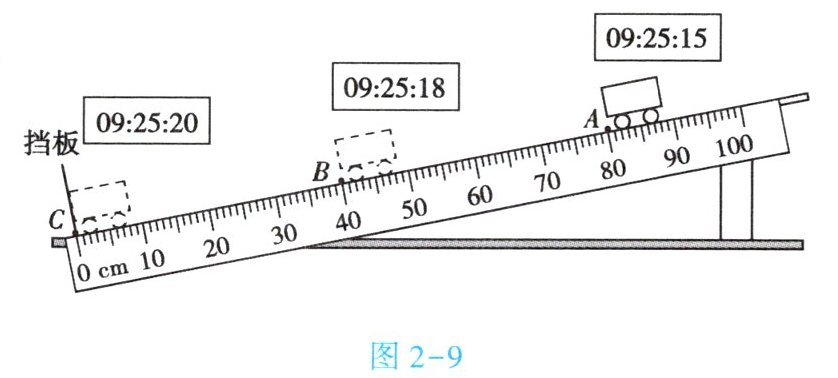 8. ($★★★$)如图 2 - 9 所示是“测量小车的平均速度”的实验装置。实验时,小车从斜面的$A$点由静止滑下,分别测出小车到达$B点和C$点的时间,即可求出不同路段的平均速度。