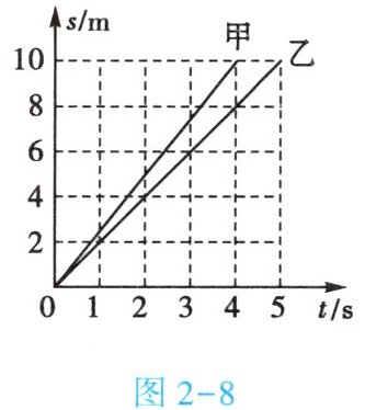 7. ($★★★$)在某校举办的机器人模拟救援比赛中,甲、乙两机器人同时从同一地点出发,沿直线匀速运动到$10m$远的目的地,它们运动的路程随时间变化的图像如图 2 - 8 所示。下列说法正确的是【