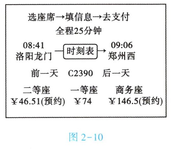 9. ($★★★$)小洛要从洛阳去郑州大学参加比赛,有两种出行方式:①乘私家车,导航规划路线的行程方案为$123km$,用时$1h30min$;②乘高铁,列车时刻表截屏如图 2 - 10 所示,进出站和候车总时间预计$40min$。小洛计划从家到洛阳龙门站和从郑州西站到郑州大学乘坐出租车,地图显示这两段路程共计$27km$,出租车的平均车速约为$10m/s$。