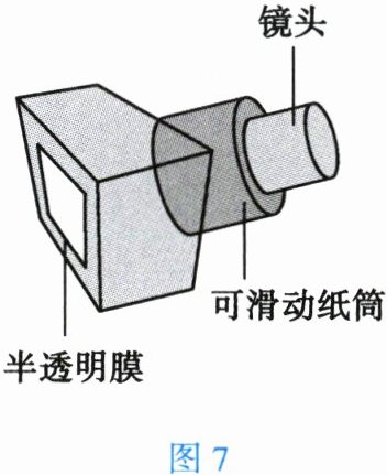 11. 如图7所示是创新小组的同学们自制的照相机。在较暗的教室内,让凸透镜对着明亮的室外,拉动纸筒,在半透明膜上可看到室外实验楼清晰的像,若想在半透明膜上成实验楼更大清晰的像,下列做法正确的是【