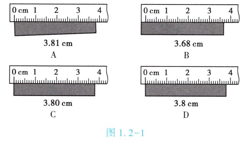4. (★★)用毫米刻度尺对一工件做如图1.2-1所示的4次测量,其中测量方法和读数都正确的是【