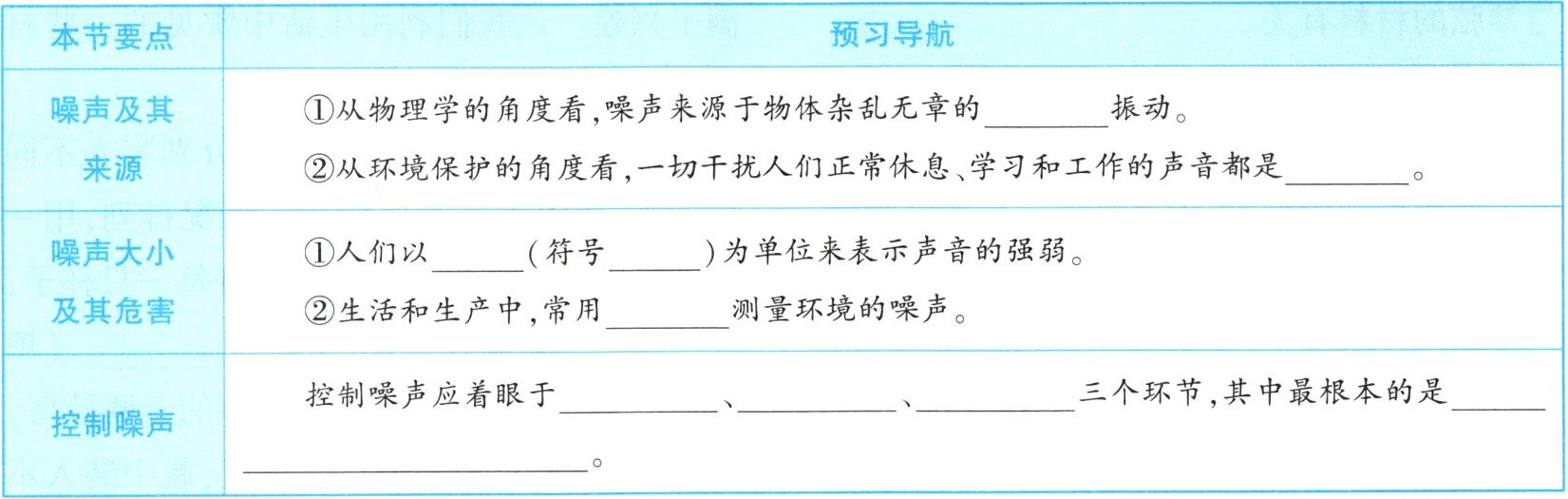 | 噪声及其来源 | ① 从物理学的角度看,噪声来源于物体杂乱无章的_无规则_振动。 ② 从环境保护的角度看,一切干扰人们正常休息、学习和工作的声音都是_噪声_。 |