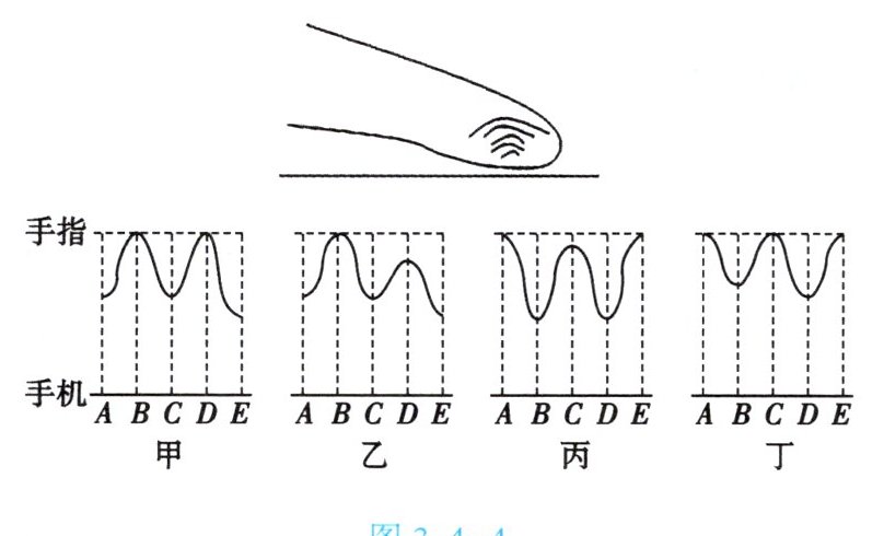 (填“信息”或“能量”)工作的。放大手指局部,表面是凹凸不平的。超声波指纹识别系统发出的超声波遇到手指上A、B、C、D、E五个位置,如图3.4 - 4所示,测得回波信号的时间分别为$0.30\ ms$,$0.36\ ms$,$0.30\ ms$,$0.36\ ms$,$0.26\ ms$。根据时间,求出手指与手机平面的距离,就可以绘出指纹的大致形状,则该处指纹的大致形状如图中的丙