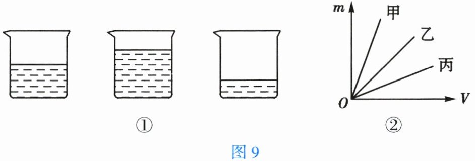 15. 如图9①所示,桌面上放有三个相同的玻璃杯,分别装有质量相同的三种液体甲、乙、丙,它们的质量与体积的关系如图9②所示,三个杯子从左至右依次装的液体种类是
