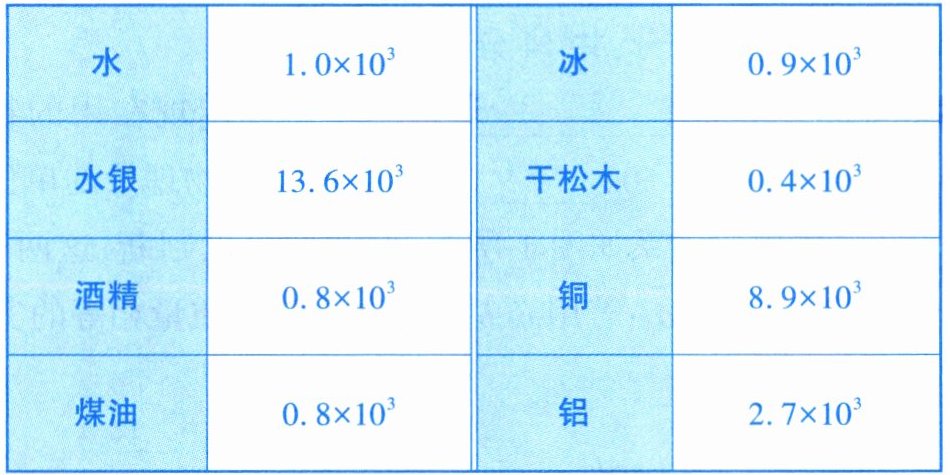 | 酒精 |$ 0.8×10^3 $| 铜 |$ 8.9×10^3 $|