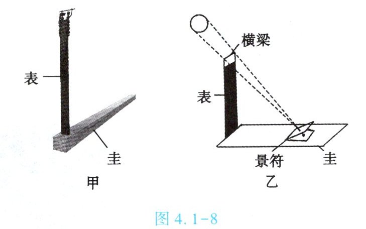 我国古代的天文观测水平一直居于世界领先地位,天文学家们发明了许多先进的天文观测仪器,其中圭表就是典型的代表。如图 4.1 - 8 甲所示,圭表包括圭和表两部分,正南北方向平放的尺,叫作圭,直立在平地上的标竿或石柱,叫作表,圭和表相互垂直。依据圭表正午时表影长度的变化,就能推算出二十四节气,依据表影长短的周期性变化,就能确定一回归年的天数。