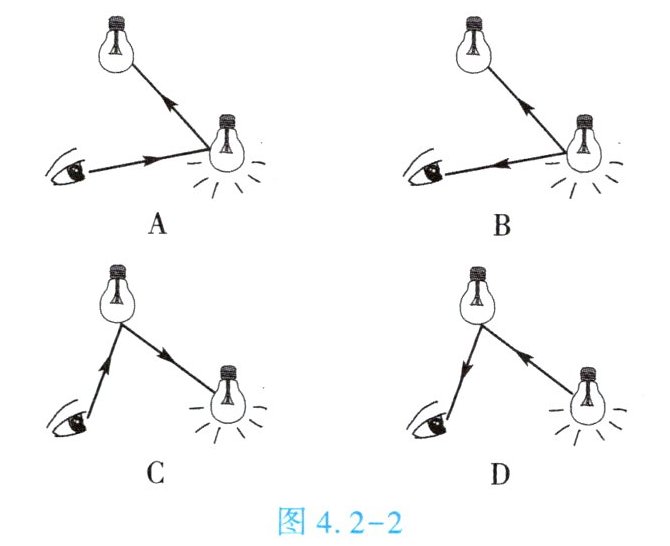 1. (★★)房间里有两盏电灯,只有一盏灯点亮,但人能看到未点亮的灯泡。以下对于“看到未点亮的灯泡”所画的光路图(如图 4.2 - 2 所示),正确的是【