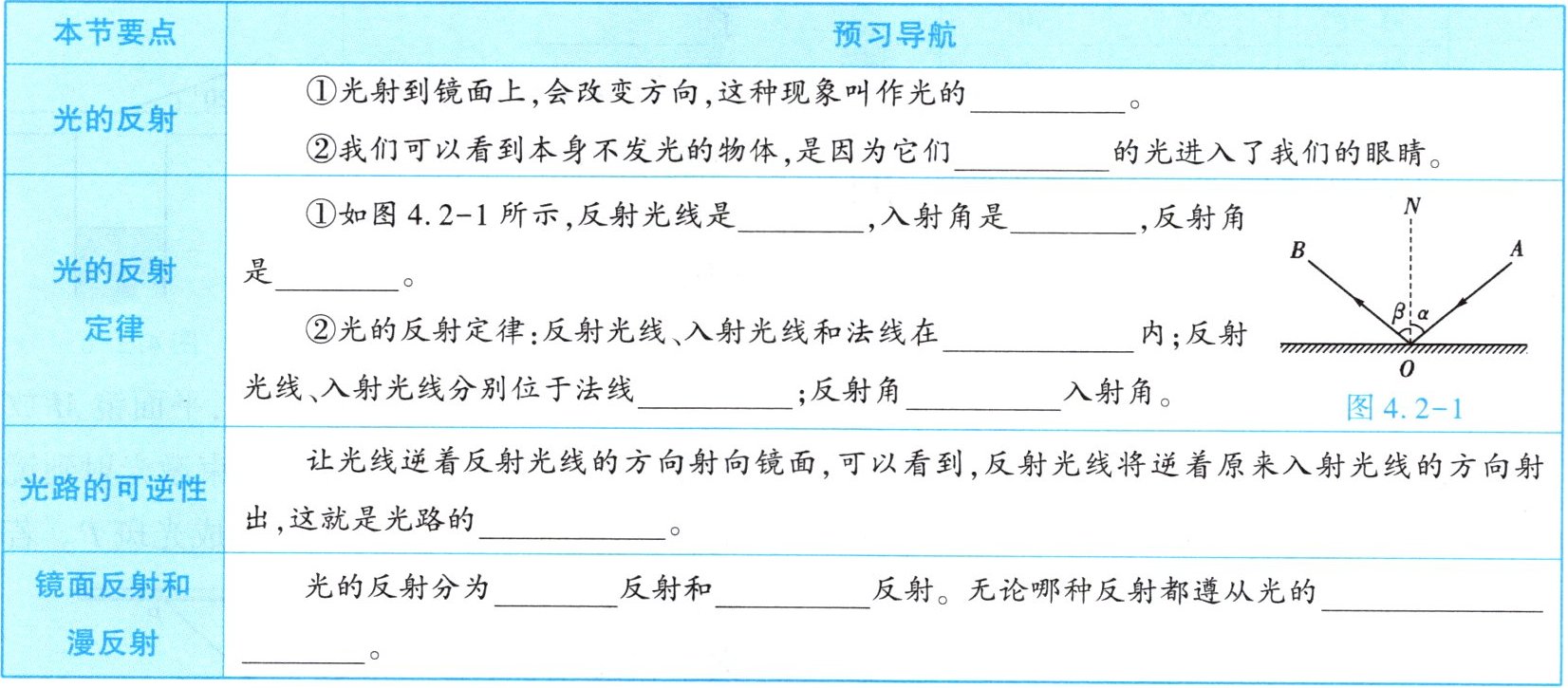 |光的反射定律|①如图 4.2 - 1 所示,反射光线是