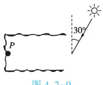 5. (★★★)如图 4.2 - 9 所示,护林员利用一块平面镜使此时的太阳光(与竖直方向成 $ 30^{\circ} $ 角)水平射向山洞中 $ P $ 点,请你通过作图标出平面镜的位置,并标出反射角的度数。