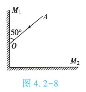4. (★★★)在图 4.2 - 8 中,两块平面镜互相垂直放置,入射光线 $ AO $ 与平面镜 $ M_1 $ 的夹角是 $ 50^{\circ} $,此光线在平面镜 $ M_2 $ 上的反射角是