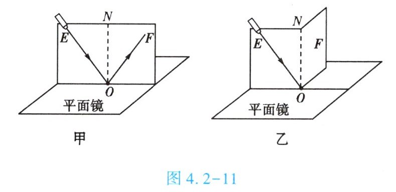 。小明想:当纸板折到如图 4.2 - 11 乙位置时,反射光还存在吗?请设计一种验证方法:将另一纸板(或光屏)放在反射光线可能存在的位置,观察是否有光斑
