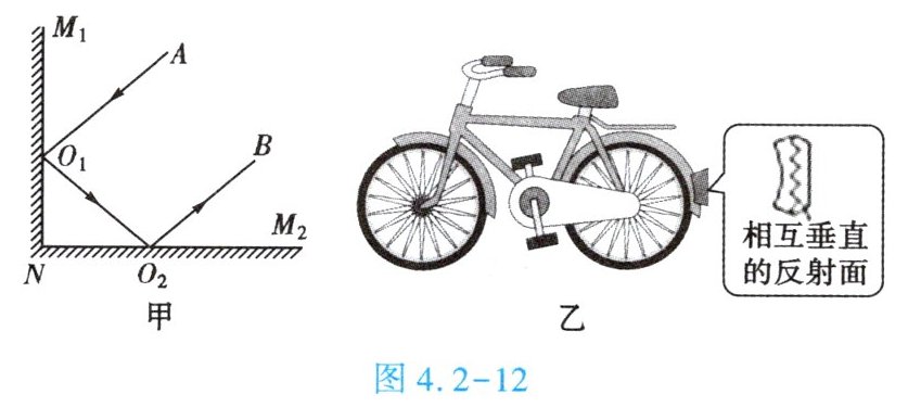 (2) 如图 4.2 - 12 乙所示是一种自行车尾灯简化后的平面示意图,它由一些相互垂直的反射面组成。根据(1)中的结论说明自行车尾灯这样设计的好处。