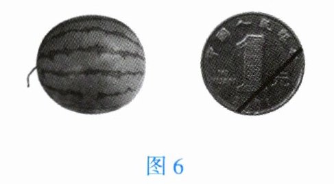 8. 小明同学到南美洲游学,见到一种外表酷似微型西瓜的野生水果,其独特的迷你造型和清爽的口感令人称奇。图 6 是迷你“西瓜”与一元硬币放在一起的对比照,根据图片信息,估测该迷你“西瓜”的长度约为【