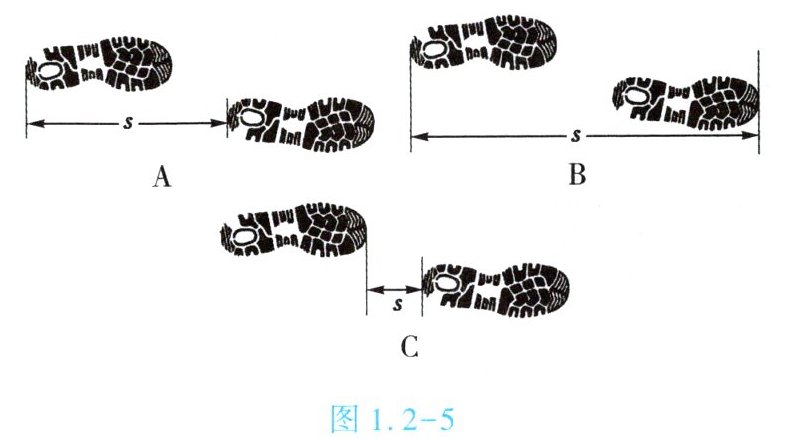 (1)小红在微湿的泥土地上按照慢走的方式前进,测量步距,标记步距为s。图1.2-5中测量方式正确的是(