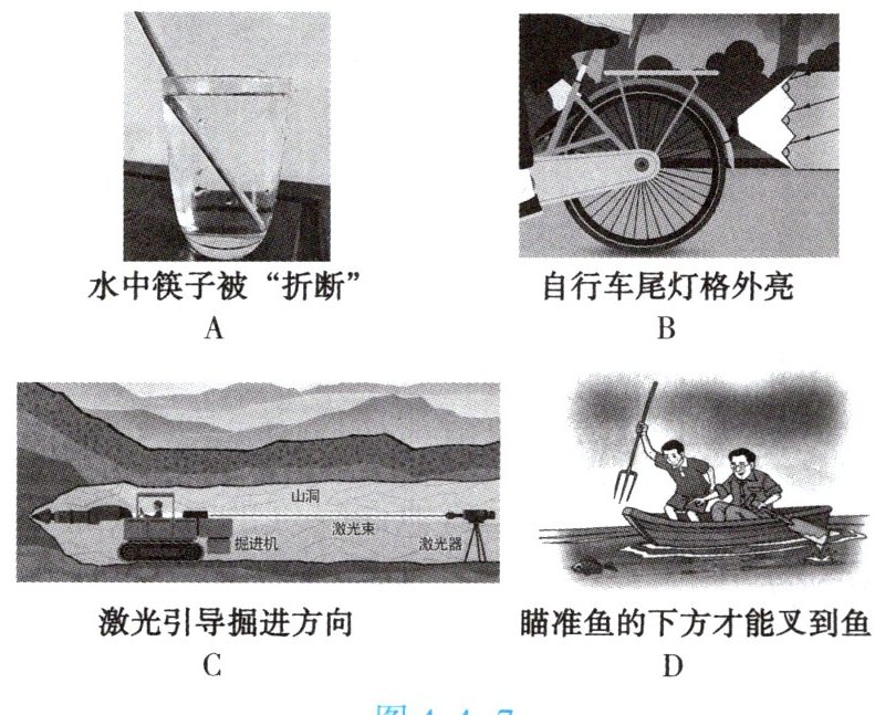 4. (★★★)(双选)清澈见底、看起来不过齐腰深的池水,不会游泳的人千万不要贸然下去,否则,可能会发生危险,因为它的实际深度会超过你看到的深度。这里涉及一个很重要的光学规律,如图 4.4 - 7 所示的实例也涉及这个规律的是【