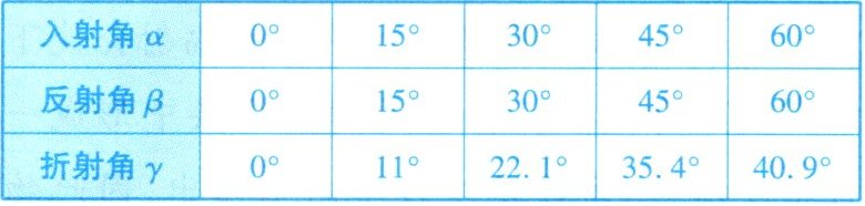 |折射角 $ \gamma $| $ 0° $| $ 11° $| $ 22.1° $| $ 35.4° $| $ 40.9° $|
