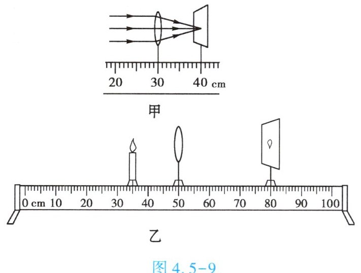 6. (★★★)在“探究凸透镜成像的规律”实验中,某学习小组用如图4.5-9甲所示的方法测量凸透镜的焦距,正确安装并调节实验装置后,在光屏上得到一个清晰的像,如图4.5-9乙所示。下列说法正确的是【
