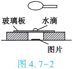 5.(★★★)(双选)如图4.7-2所示,把一滴水滴在玻璃板上,再拿一个放大镜作为目镜放在水滴的上方,这样就可以制成一个显微镜。把一幅图片放在玻璃板的下方,慢慢调节放大镜与水滴之间的距离,就可以看清玻璃板下面图片中的微小细节了。下列有关水滴显微镜的描述正确的是【