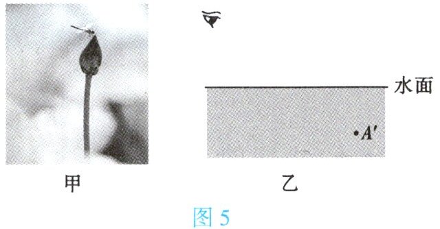 5. (★★★)古诗词是中华文化的瑰宝,“小荷才露尖尖角,早有蜻蜓立上头”描述的画面如图5甲所示。请在图5乙中画出光从蜻蜓经水面反射后进入人眼的光路图,其中A'点表示水中“蜻蜓”的位置。