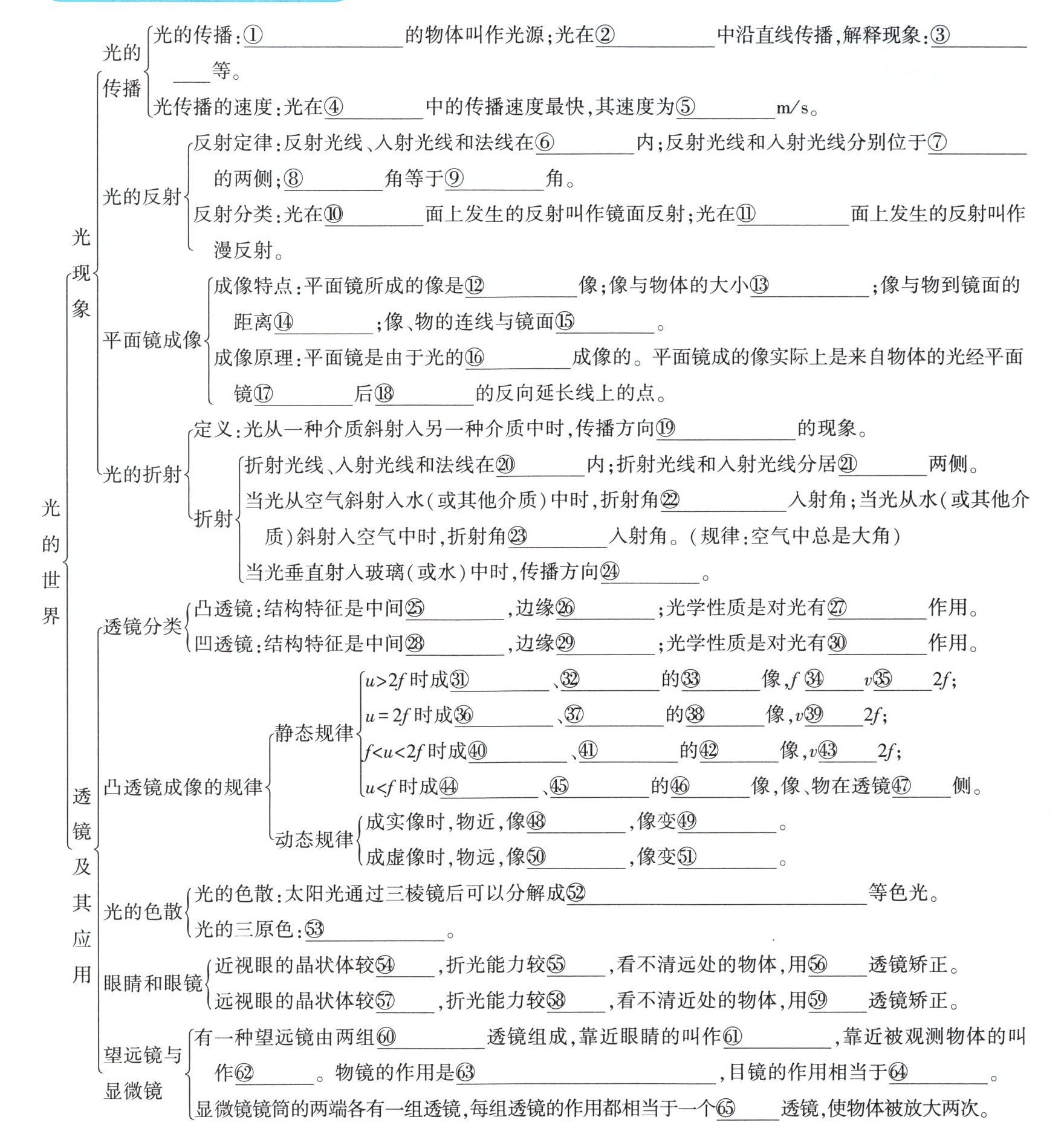 ①自身能够发光;②同种均匀介质;③影子的形成(或小孔成像、日食月食);④真空;⑤3×10⁸;⑥同一平面;⑦法线;⑧反射;⑨入射;⑩光滑;⑪粗糙;⑫虚;⑬相等;⑭相等;⑮垂直;⑯反射;⑰反射;⑱反射光线;⑲发生偏折;⑳同一平面;㉑法线;㉒小于;㉓大于;㉔不变;㉕厚;㉖薄;㉗会聚;㉘薄;㉙厚;㉚发散;㉛倒立;㉜缩小;㉝实;㉞<;㉟<;㊱倒立;㊲等大;㊳实;㊴=;㊵倒立;㊶放大;㊷实;㊸>;㊹正立;㊺放大;㊻虚;㊼同;㊽远;㊾大;㊿远;Ⓚ大;Ⓠ红、橙、黄、绿、蓝、靛、紫;Ⓡ红、绿、蓝;Ⓢ厚;Ⓣ强;Ⓤ凹;Ⓥ薄;Ⓦ弱;Ⓧ凸;Ⓨ凸;Ⓩ目镜;ⓐ物镜;ⓑ成倒立、缩小的实像;ⓒ放大镜;ⓓ凸