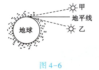 2.(★★)诗句“大漠孤烟直,长河落日圆”展现了一幅美丽的画卷。如图4 - 6所示,诗人观察到的落日其实是阳光经过大气层发生了光的