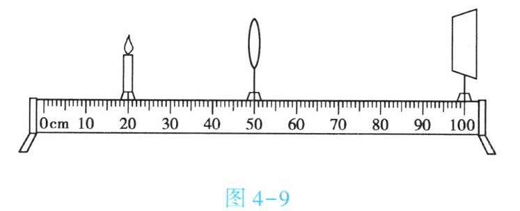 5.(★★)如图4 - 9所示是“探究凸透镜成像的规律”的实验装置,凸透镜的焦距为10 cm,点燃的蜡烛与凸透镜固定不动。移动光屏,直到烛焰在光屏上成清晰的像,则该像是