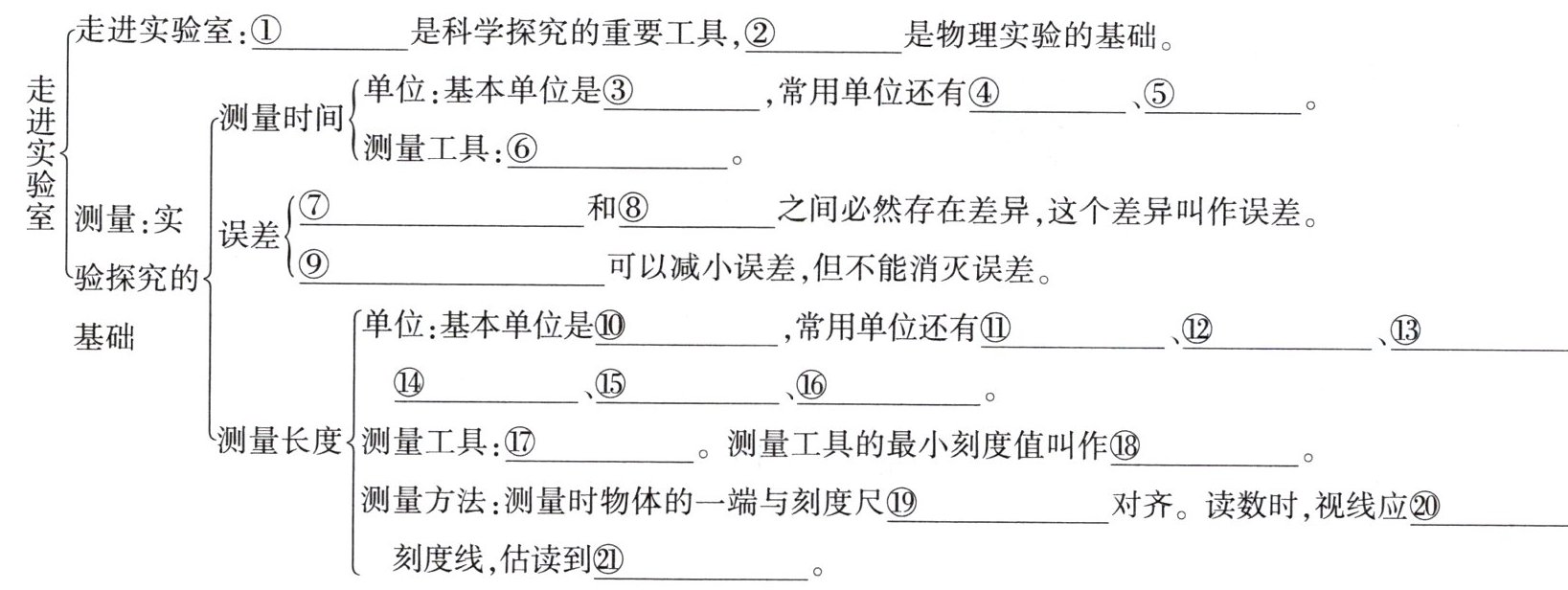 ①仪器 ②测量 ③秒 ④小时 ⑤分钟 ⑥停表 ⑦测量值 ⑧真实值 ⑨多次测量求平均值 ⑩米 ⑪千米 ⑫分米 ⑬厘米 ⑭毫米 ⑮微米 ⑯纳米 ⑰刻度尺 ⑱分度值 ⑲零刻度线 ⑳正对 ㉑分度值的下一位