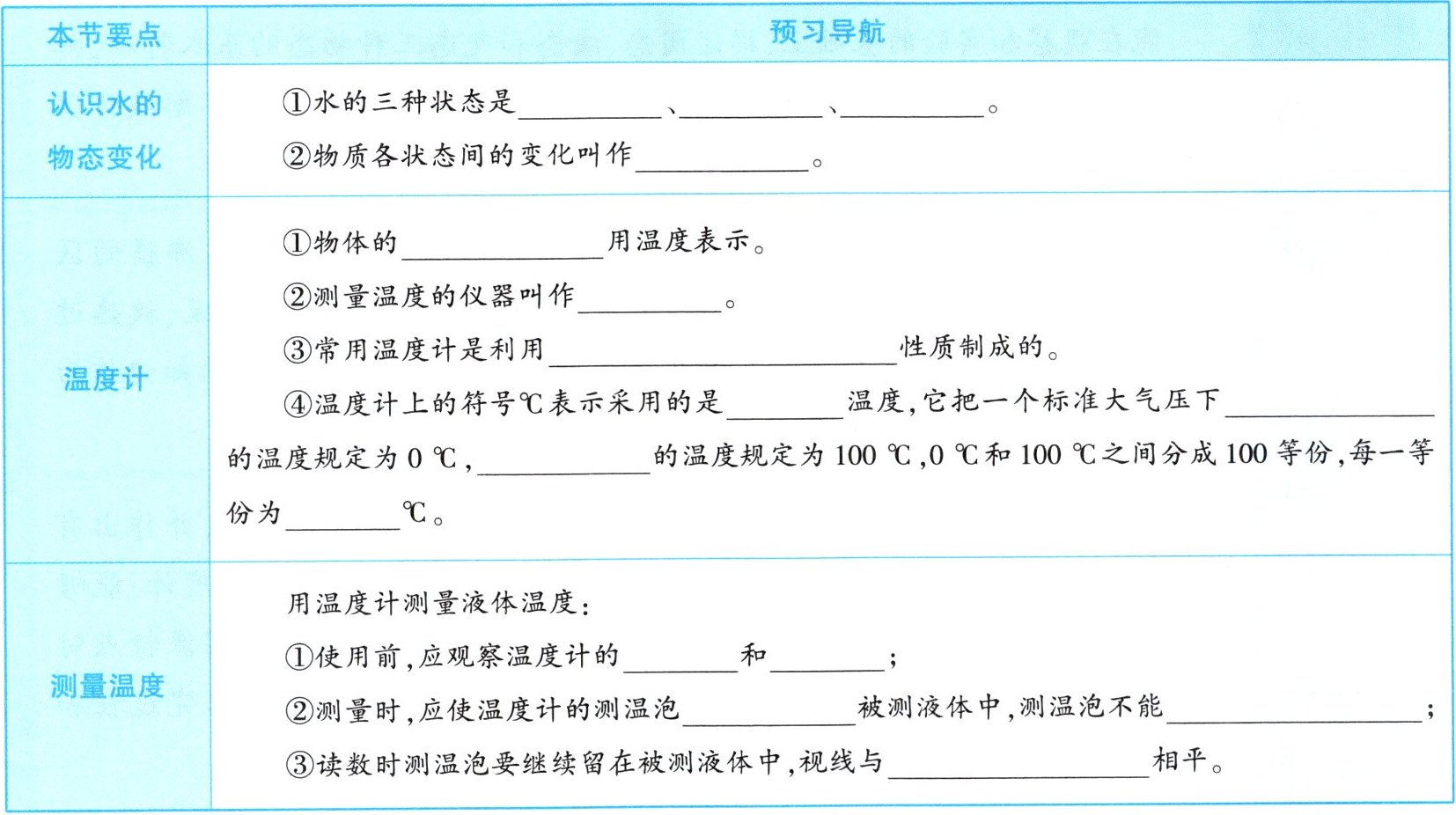 测量温度:①量程;分度值;②全部浸入;接触容器底或容器壁;③温度计中液柱的上表面。