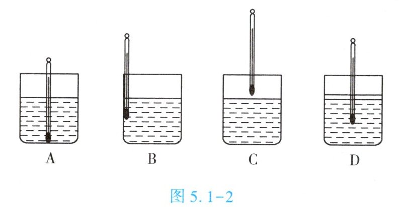 4. (★★)小强在用温度计测量烧杯中液体温度时读取了四次数据,每次读数时温度计的位置如图5.1-2所示,其中正确的是【