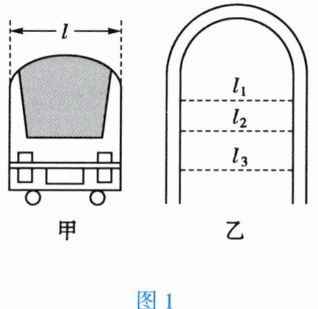 4. 如图1甲所示,新式列车车厢的宽度$ l = 3.500\ m $。为判断新式列车车厢能否通过一处老式隧道,技术人员分别测量了隧道内部三处的宽度,如图1乙所示,测量结果为$ l_1 = 3.600\ m $、$ l_2 = 3.480\ m $、$ l_3 = 3.540\ m $。技术人员使用的刻度尺分度值为