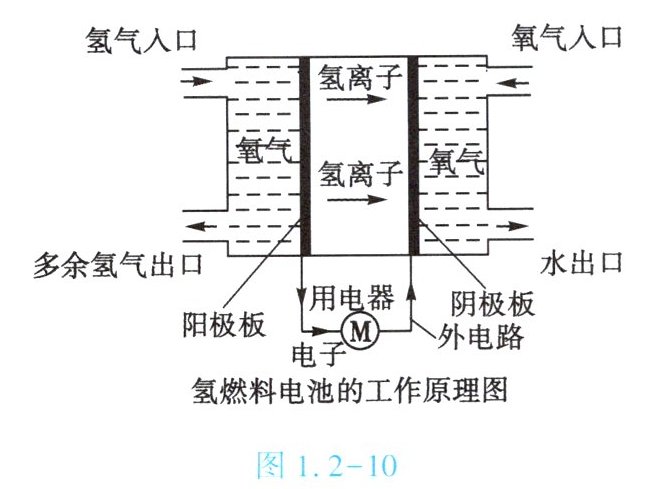 氢动力汽车是一种无污染、零排放的新型能源交通工具。氢动力汽车主要有氢内燃汽车和氢燃料电池汽车两种。氢内燃汽车在内燃机中燃烧氢产生动力,一般来说,轿车行驶$100$km耗氢大约$1$kg,与传统汽车相比成本至少低$20\%$。氢燃料电池汽车利用氢燃料电池提供动力,如图1.2-10所示是氢燃料电池的工作原理图。它的工作原理是将氢气送到燃料电池的阳极板,经过催化剂的作用,氢分解成带正电的氢离子(质子)和带负电的电子,氢离子穿过质子交换膜,到达燃料电池的阴极板;而电子是不能通过质子交换膜的,只能经外部电路,到达燃料电池的阴极板,从而在外部电路中产生电流,提供动力。电子到达阴极板后,再与氧气和氢离子重新结合成水,整个过程实现了化学能与电能的转化。