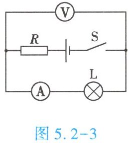 5. ($\star\star\star$) 如图 $5.2 - 3$ 所示的电路图中,电源电压为 $1.5\ V$,电阻 $R$ 的阻值为 $2\ \Omega$,闭合开关 $S$ 后,电流表的示数为 $0.3\ A$,则通过小灯泡的电流为