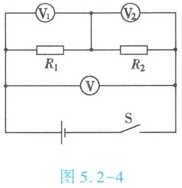4. ($\star\star$) 如图 $5.2 - 4$ 所示的电路图中,闭合开关 $S$ 后,电压表 $V$、$V_{1}$、$V_{2}$ 的示数分别是 $U$、$U_{1}$、$U_{2}$,要计算通过 $R_{2}$ 的电流 $I_{2}$,下列关系式错误的是【