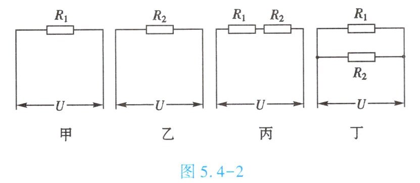 2. ($\star\star$)如图 5.4 - 2 所示的电路图中,电源电压$U$相同,$R_{1} < R_{2}$,电路中的总电阻由小到大的顺序是【