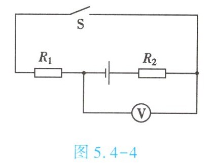 7. ($\star\star$)如图 5.4 - 4 所示,电源电压保持不变,$R_{1} = 8\Omega$,$R_{2} = 7\Omega$,闭合开关$S$后,电压表的示数为$4V$,则电源电压为【