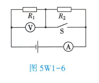 9. (★★★) 如图 5W1 - 6 所示,$ R_2 = 2 Ω $,当开关 S 断开时,电流表的示数为 1 A,电压表的示数为 4 V。当开关 S 闭合时,电流表和电压表的示数分别是多少?