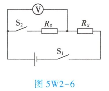 (5) 他们又对实验进行了拓展,利用电源 (电压未知且恒定不变)、阻值为 $ R_0 $ 的定值电阻、电压表、开关等器材,设计了如图 5W2 - 6 所示的电路图,也测出了 $ R_x $ 的阻值。实验步骤如下: