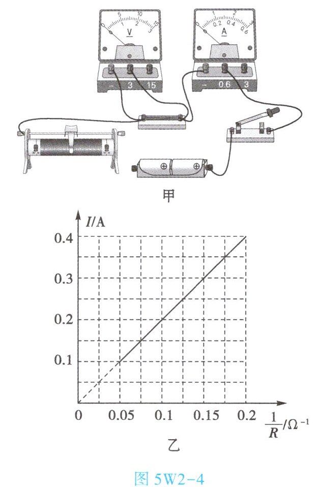 。(4) 排除故障后进行实验,根据实验数据绘制出电流与电阻的倒数的关系图像,如图 5W2 - 4 乙所示。由图像可知,电阻 $ R $ 两端的电压为