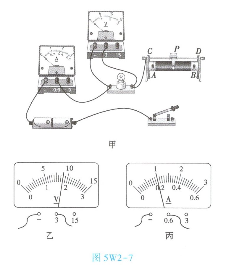 (4) 当小灯泡正常发光时,电流表的示数如图 5W2 - 7 丙所示,则小灯泡正常发光时的电阻为 ______ Ω。为了减小误差,小杨继续移动滑动变阻器的滑片,测量了几组电流、电压值,求小灯泡电阻的平均值。你认为他的做法合理吗? ______,你判断的理由是 ______。