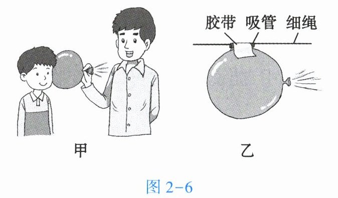 (2)如图2-6乙所示,松开气球的口子,气球向后喷出气体的同时,气球会沿着绳子快速向前飞去,这说明