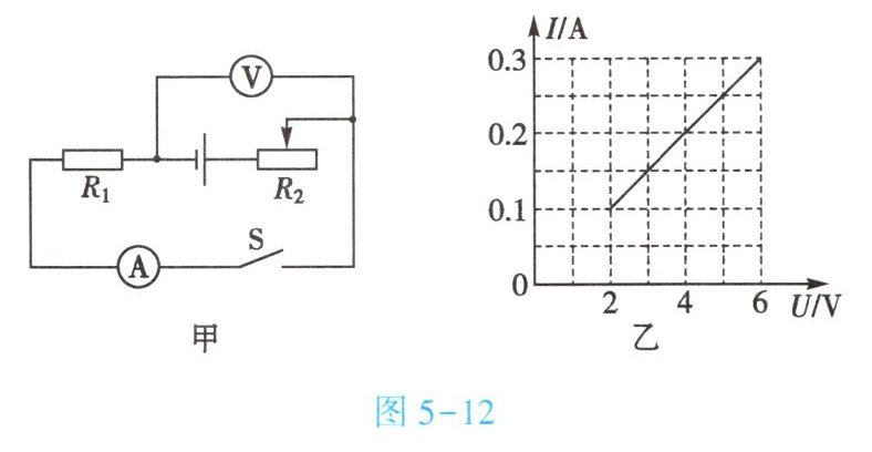 9. (★★★)如图5-12甲所示的电路图中,电源电压为6V,$R_1$为定值电阻,闭合开关$S$后,移动滑动变阻器$R_2$的滑片从一端到另一端的过程中,电流表与电压表示数的关系如图5-12乙所示,则$R_1= $