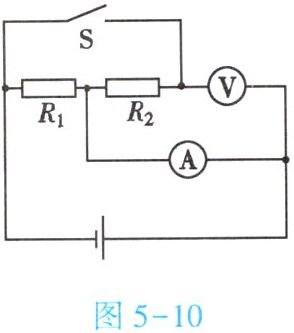 7. (★★)如图5-10所示,电源电压不变,$R_1= 10Ω$,$R_2= 20Ω$。当开关$S$断开时,电流表的示数为0.6A;当开关$S$闭合时,电压表的示数为