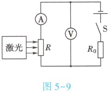 6. (★★★)为保障安全,现在很多室内公共场所安装有烟雾报警装置,如图5-9所示是烟雾报警装置的简化原理图。电源电压保持不变,$R_0$为定值电阻,光敏电阻$R$的阻值随光照强度的减弱而增大,当电路中的电流减小至某一数值时开始报警。闭合开关$S$,当射向光敏电阻$R$的激光有烟雾遮挡时,下列说法正确的是【】