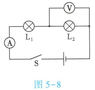 5. (★★★)如图5-8所示,电源电压为3V,闭合开关$S$,两只规格相同的灯泡$L_1$、$L_2$都亮,通过它们的电流之比为